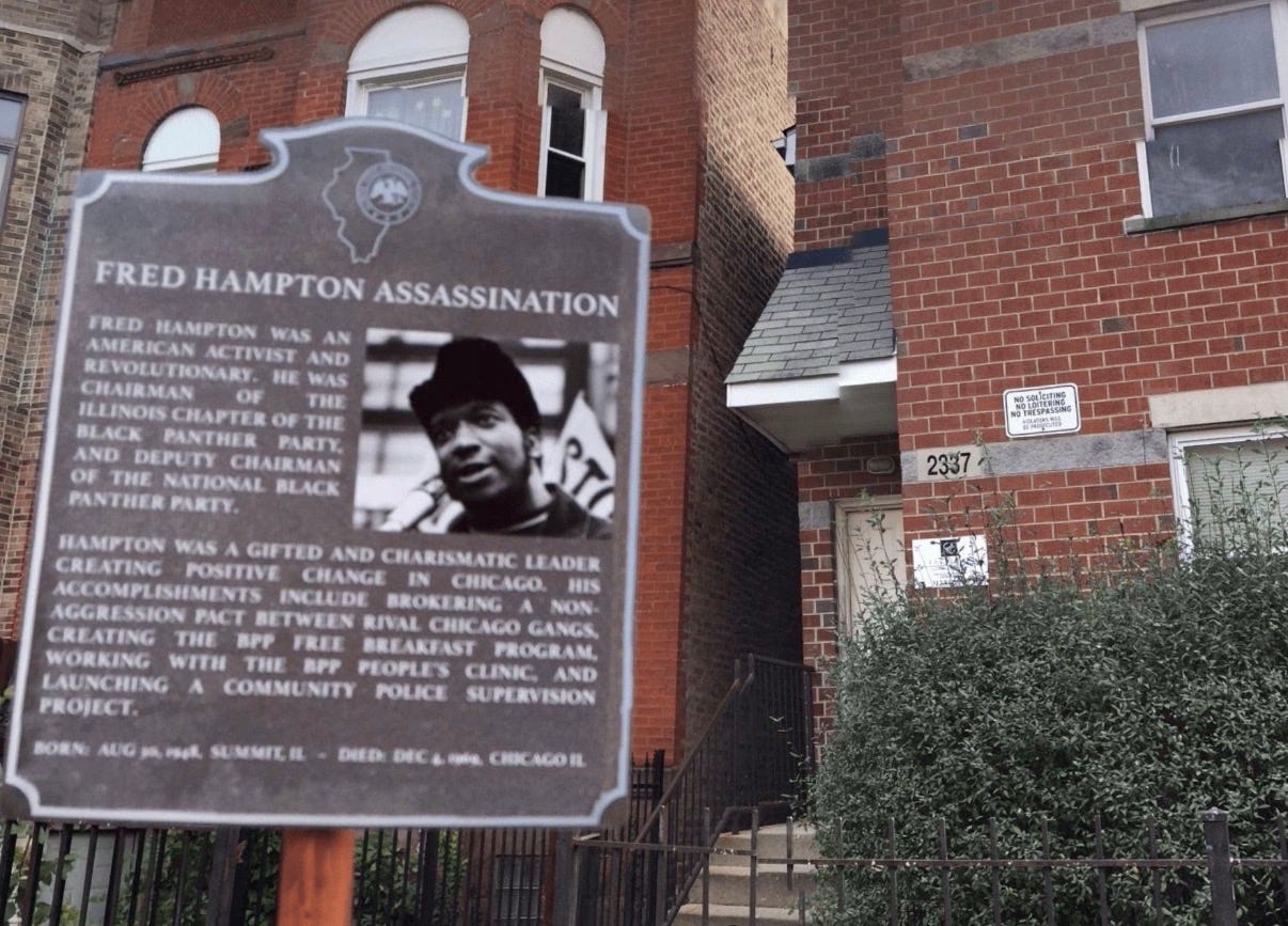 Two deaths withheld. Two catharses deliberately denied. And the geography matters. Fred Hampton was killed in Chicago. The building where he was assassinated no longer stands. The address remains. The street bears his name. The site has been absorbed into the city’s surface—a place you can pass without knowing what happened there. That is how memory is managed: what remains visible, what disappears.