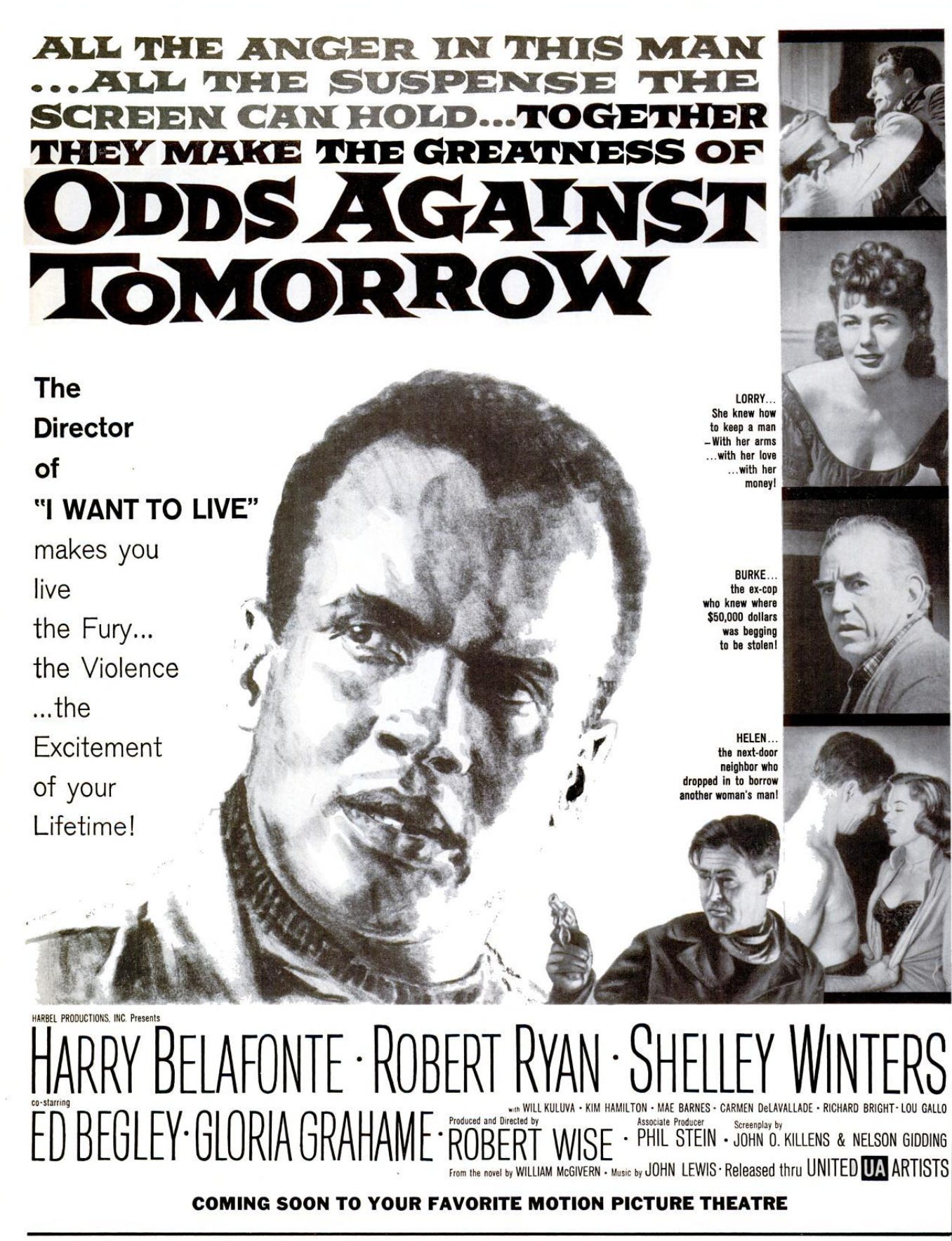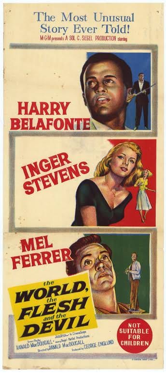 Harry Belafonte understood this at the level of production. Through his own company, he produced films in the late 1950s that moved against the grain of Hollywood’s racial and narrative constraints—most notably Odds Against Tomorrow and The World, the Flesh and the Devil. Both films were critically recognized for their ambition and thematic risk—Odds Against Tomorrow confronting racism within the structure of a heist film, The World, the Flesh and the Devil staging race, isolation, and desire in a post-apocalyptic frame that refused easy resolution.